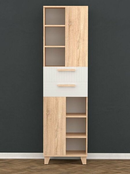 Шкаф-пенал Копенгаген — это отличный функциональный элемент для гостиной. Пенал оснащен открытыми полками и полками со створками, что позволяет хранить и предметы декора, и личные вещи, документы, книги. Он станет стильной частью интерьера в современной квартире в скандинавском стиле или лофт. Шкаф имеет комбинированные фасады: открытые полки, дверцы, за которыми также есть место для хранения, выдвижные ящики для мелких вещей. Для плавности хода створок петли оснащены доводчиками. В конструкции пенала имеются ящики, оснащенные шариковыми направляющими полного выдвижения. Современная система «push-to-open» позволяет открывать створки нажатием руки. Размеры: ширина – 55 см, глубина – 40 см, высота – 186 см. Размер полки – 380х251 мм. Материал: корпус – ЛДСП 16 мм (кромка 0,4 мм в цвет корпуса), фасады – МДФ 16 мм (фрезеровка фасадов ящиков, покрыты премиальной ПВХ-пленкой Praim). Задняя стенка – лхдф 3,2 мм. Цвет: дуб сонома / белый матовый. Ручки и ножки тонированы в цвет корпуса изделия. Наполнение: открытые ниши с 2 полками в каждой; 2 дверцы; 2 ящика. Способ установки: напольный. Ручки: деревянные, длина 128 мм, изготовлены из массива дуба. Под ручки на всех фасадах с обратной стороны сделаны «наметки» методом сверловки, т. е. нет сквозных отверстий и при желании можно использовать свои ручки. Дверцы: петли с доводчиками для плавного закрывания. Опоры: деревянные ножки из массива сосны, высота – 10 см. Ящики: оборудованы шариковыми направляющими полного выдвижения 350 мм. Крепеж: с использованием эксцентриковой стяжки (часто называют минификсом, — это тип скрытого крепежа, главным преимуществом которого является его незаметность и возможность многократно снимать и снова соединять детали конструкции, не жертвуя прочностью). Товар поставляется в разобранном виде. Мы рекомендуем собирать мебель с привлечением профессиональных сборщиков и согласно инструкции, поставляемой вместе с товаром.
