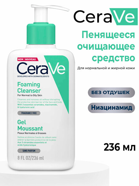 Пенка для умывания CeraVe Foaming Cleanser для нормальной и жирной кожи лица и тела, 236 мл, увлажняющий очищающий гель с гиалуроновой кислотой для проблемной кожи против прыщей