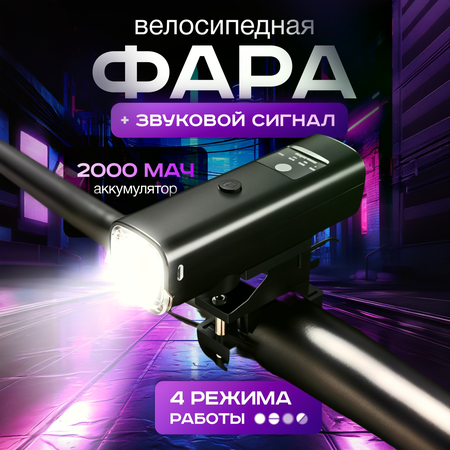 Велосипедный фонарь со встроенным сигналом 120 Дб, аккумуляторный заряжающийся через USB кабель (в комплекте). Велофара имеет 4 режима: