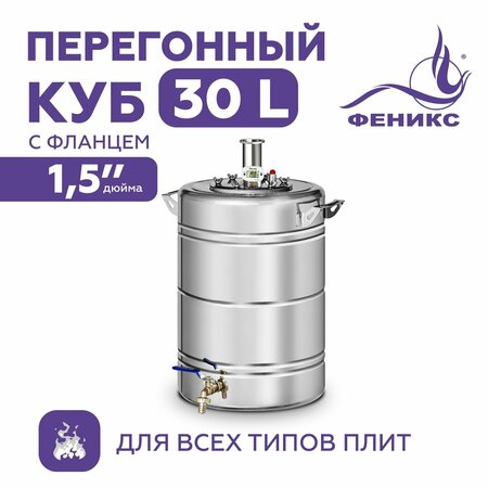 Перегонный куб Феникс 30 литров с фланцем 10 см под колонну 1,5" для самогонного аппарата -это классический перегонный бак - кастрюля с фланцевым креплением. Дистиллятор надежно крепится при помощи шести стальных барашков. За герметичность отвечает прокладка из пищевого силикона. Диаметр горловины 11 сантиметров, что позволяет беспрепятственно просунуть руку для очистки перегонного куба после дистилляции. Перегонный куб оснащен ребрами жесткости, сохраняющими форму кастрюли как при нагреве, так и при хранении. Ферромагнитное дно позволяет устанавливать аппарат на любую нагревательную поверхность, будь то газовая, электрическая или индукционная плита. В этой модели предусмотрен кран для слива барды.