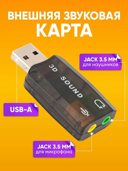 Переходник разветвитель с USB-A на два аудиоразъема AUX Jack 3.5мм Soundcard 3D помогает подключать одновременно наушники и микрофон или аудиоустройства с 3,5-мм разъемом к устройствам с портом USB-A, таким как современные смартфоны или ноутбуки. Оригинальный переходник для наушников, микрофона, внешняя звуковая карта – это универсальный адаптер, который используется для подключения наушников, микрофонов при отсутствии разъема aux jack 3.5mm. Звуковая карта удобный аксессуар, который позволяет подключить 2 пары наушников с разъемом 3,5 мм (а также с aux, или jack, разъемом) к устройствам с разъемом USB-A. Usb адаптер незаменимый девайс для всех, кто любит прослушивать аудио на своих устройствах. Переходник usb также может использоваться как соединитель или разветвитель для проводов, и кабелей. Usb переходник предназначен для прослушивания музыки, для звонка и просмотра видео на мобильных устройствах и позволяет получить высококачественный звук без искажений.