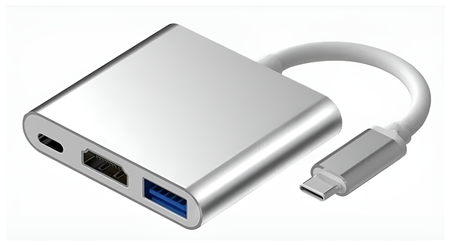 Многофункциональность: Переходник оснащен тремя разъемами: USB 3.0 для быстрой передачи данных, HDMI для поддержки видео разрешения 4K и дополнительный Type-C для зарядки.