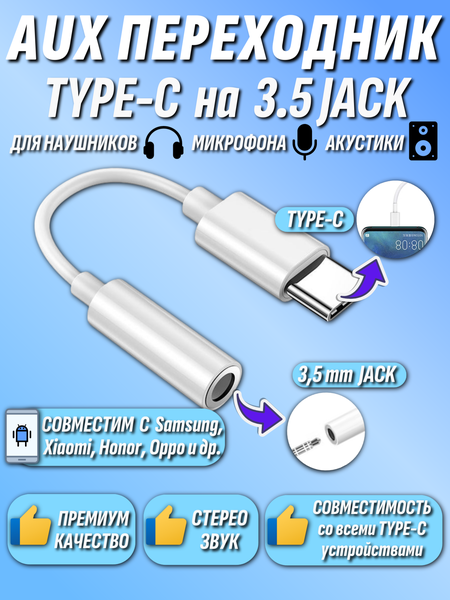 Переходник Type-С на jack 3.5 Переходник, предназначен для прослушивания музыки, разговоров, записи голоса и сообщений и видео в чатах, обычными наушниками, или подключения смартфонов не имеющих выхода 3.5 Jack к аудио системам колонкам ресиверам к автомобильной акустике Переходник работает с гарнитурами и наушниками, имеющими 4-pin штекер 3.5 Jack, для подключения большой гарнитуры или компьютерных наушников понадобится переходник с 3-pin на 4-pin! Очень удобная и нужная вещь дополнит ваш смартфон Совместимость Samsung Huawei Xiaomi Honor Mi Redmi Realme Tecno infinix и другие смартфоны с Type-C выходом