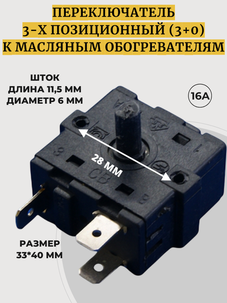 Переключатель 3-х позиционный (3+0) к масляным обогревателям: функциональность и надежность Переключатель 3-х позиционный (3+0) к масляным обогревателям предназначен для обеспечения удобного и безопасного использования оборудования. Он имеет 3 клеммы подключения и обеспечивает 16А мощности, что гарантирует надежность и долговечность работы. Совместимость и использование Он служит для переключения режимов обогревателя, обеспечивая комфортное и безопасное использование оборудования. Выбирая переключатель 3-х позиционный (3+0) к масляным обогревателям, вы получаете надежный и функциональный аксессуар, который обеспечит удобство и безопасность использования вашего оборудования.