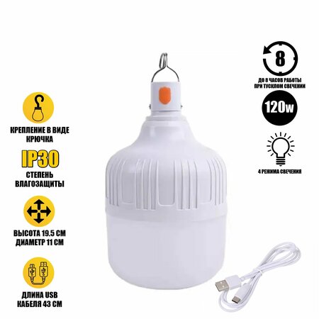 Переносная аккумуляторная лампа для автомобиля гаражная, 120W - это яркая светодиодная лампа, которая станет незаменимым помощником во время работы в гараже с автомобилем, а также во время отдыха на природе, во дворе, на даче в гараже и т. д. Лампа с подвесным креплением (крючком), а значит ее можно разместить в любом удобном для вас месте, например, подвесить под потолком в гараже или разместить в багажнике в темное время суток. Также лампа гаражная позволит добавить света в местах, где он необходим, например, в кладовке, в подвале, также дает отличную освещенность багажника автомобиля. Она очень проста в использовании, управляется одной кнопкой включения, можно заряжать через кабель USB (от Power bank, от ноутбука, от авто или от сети). Имеет 4 режима свечения: яркий, экономичный, 2 мерцающих (1 при долгом нажатии). Со временем, когда яркость света уменьшается, возможно подключение лампы к повербанку с помощью USB-кабеля, который идет в комплекте. При такой подзарядке время работы увеличивается в несколько раз. Во время зарядки светится индикатор, по окончании индикатор гаснет. Лампа автомобильная - яркая светодиодная лампа, которая станет незаменимым помощником для вас. Особенности: - Автомобильный фонарь имеет крепление в виде крючка, который можно использовать в любом удобном для вас месте. - Фонарик гаражный очень прост в использовании, управляется одной кнопкой включения. - Полностью заряженная лампа для гаража будет обеспечивать устойчивый свет до 3 часов при ярком режиме, до 8 часов при тусклом свечении. - Может работать во время зарядки. - Небольшой вес и компактный размер. Характеристики: - Тип: лампа автономная переносная. - Мощность: 120 Вт. - Цвет: белый. - Диаметр: 11 см. - Высота: 19,5 см. - Длина провода: 43 см. - Количество режимов: 4 ( Максимальный/экономичный/ 2 мерцающих). - Материал корпуса: ABS-пластик. - Уровень защиты: IP30. - Заряжается от USB. - Работает от встроенного аккумулятора. - Емкость АКБ: 2400 миллиампер. Гарантийный срок - 1 месяц В комплекте: - Фонарь аккумуляторный, 120W - 1 шт. - USB кабель - 1 шт. - Крючок - 1 шт.