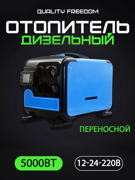 Автономный переносной дизельный отопитель/сухой фен 12V/24V/220V 5кВт с 2 металлических сопло. Сухой фен собранный в компактном корпусе. Мощность отопителя регулируется от 1кВт до 5кВт, 6 скоростей. Отопитель работает на дизельном зимнем топливе или керосине и питается от обычной розетки 220V или от аккумулятора 12V или 24V. Отопитель автоматически определяет к какой сети подключили. Камера сгорания - нержавеющая сталь. Устройство комплектуется пультом управления с индикацией мощности, напряжения, температуры. Имеет пульт дистанционного управления с дальностью действия до 50метров. Применяется для обогрева гаража, зимней палатки, кабин грузовиков, теплиц, бытовки. Характеристики: Тепловая мощность: от 1000Вт до 5000Вт. Расход дизельного топлива: 0,15-0,65л/ч. Встроенный климат контроль. Объём бака: 5 литров.