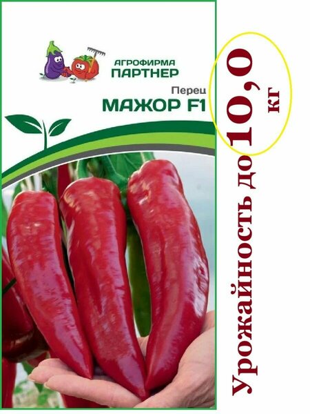 Перец сладкий мажор (1 упаковка*5 штук семян). Раннеспелый гибрид типа Капия. От всходов до технической спелости проходит около 100 дней. Растение среднерослое, полураскидистое. На растении одновременно формируется более десятка выравненных узкоконусовидных плодов длиной около 20 см, диаметром — 4-6 см. Плоды глянцевые, насыщенно-красного цвета, массой — 90-120 г, толщина стенок — 4-6 мм. Вкусовые и товарные качества плодов великолепные. Перцы универсального назначения: хороши как в свежем, так и в консервированном виде. Гибрид характеризуется продолжительным периодом плодоношения и хранения, отличается хорошей транспортабельностью. Устойчив к основным грибным и вирусным заболеваниям перца; теневынослив и толерантен к пониженным температурам. Плотность посадки — 3-4 растения/м² при формировке в 3-4 стебля. Урожайность — 5,0-8,0 кг/м². Перец предпочитает солнечные участки с питательным грунтом, богатым органическим веществом. Рекомендуется выращивать растения в защищенном грунте или в открытом грунте с использованием временного укрытия на случай непогоды и с соблюдением ежегодного севооборота. Растения следует выращивать с обязательной опорой и подвязкой во избежание обламывания хрупких побегов с плодами.