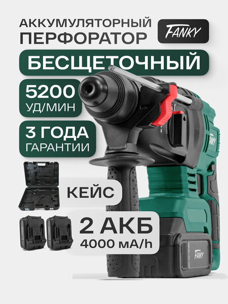 Перфоратор аккумуляторный Fanky - это мощный и надежный инструмент, который станет незаменимым помощником при выполнении строительных и ремонтных работ. Благодаря бесщеточному двигателю, перфоратор обеспечивает высокую производительность и эффективность при сверлении, долблении и закручивании. Аккумулятор и зарядное устройство: В комплекте с перфоратором идут два аккумулятора Li-Ion типа, которые обеспечивают продолжительное время работы без прерывания. Зарядное устройство обычное, что позволяет заряжать аккумуляторы в любое время и в любом месте. Инструмент имеет пять режимов работы: сверление, долбление, сверление с долблением, свободное долбление и реверс. Защита от перегрузок и плавный пуск: Перфоратор оснащен функциями защиты от перегрузок и плавного пуска, что обеспечивает безопасность и продлевает срок службы инструмента. Антивибрационная система и блокировка кнопки включения: Конструкция перфоратора предусматривает антивибрационную систему и блокировку кнопки включения для удобства и безопасности работы. Комплектация и хранение: В комплект перфоратора входит кейс для удобного хранения и транспортировки инструмента. В комплекте также идут дополнительная рукоятка, ограничитель глубины сверления и долото. Перфоратор аккумуляторный Fanky - это надежный и мощный инструмент, который станет незаменимым помощником при выполнении строительных и ремонтных работ.