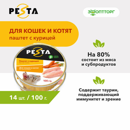 Полнорационный влажный корм для кошек Pesta паштет с курицей — это сбалансированное питание для котят и кошек на каждый день! 80% мяса и мясных ингредиентов в каждом ламистере. Корм с высоким содержанием мяса ближе к естественному питанию кошек, он обеспечивает вашего питомца всем необходимым для ежедневной активной жизни. Курица является источником высококачественного белка, который важен для здоровья мышц и общей активности вашей кошки или котенка. Мягкая текстура мокрого корма для кошек облегчает пищеварение и усвоение питательных веществ, что особенно важно для формирования пищеварительной системы. Упаковано в ламистер – полностью перерабатываемую алюминиевую упаковку, которую легко хранить и удобно использовать. Кошачий корм Песта подходит для домашних животных любого возраста и любой степени активности. Он отлично дополняет паучи и сухой корм Pesta, позволяя разнообразно и сбалансировано кормить вашего хвостатого друга. Широкий выбор текстур и вкусов позволит подобрать корм даже для привередливых питомцев. Вкусные рецепты кормов Pesta привносят кулинарные шедевры в каждую миску, обеспечивают полноценное и сбалансированное питание, помогающее вашему питомцу быть здоровым, счастливым и жизнерадостным каждый день.