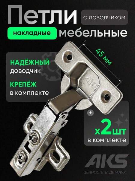 Петли мебельные с доводчиком и механизмом быстрого монтажа clip-on и доводчиком, обеспечивающим плавное и бесшумное закрывание дверей. Комплект быстросьемный и готов для сборки новой мебели или замены/ремонта старой фурнитуры. Они подходят для крепления дверей в гардеробной или кухонной мебели, шкафах, тумбах, пеналах, в доме и офисе и т. д. Накладная петля с углом установки 90 градусов имеет прямое «плечо» без изгиба. Используется для фасадов, полностью закрывающих торцы боковых стенок корпуса. Крепеж в комплекте.