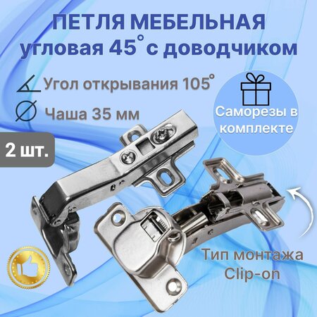 Петля мебельная четырехшарнирная для скошенных под 45 градусов мебельных корпусов, в комплекте с ответной планкой. Система легкого монтажа Clip On обеспечивает монтаж петли простым защелкиванием. Встроенный доводчик обеспечит плавное закрывание Вашей дверцы.