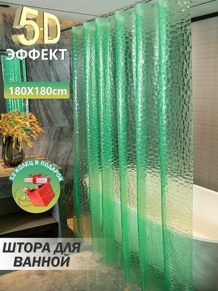 Занавеска для ванной комнаты из высококачественного материала PEVA (90GSM) с красивым рисунком «Гусиный камень» и медными кольцами. Занавеска выполнена из влагостойкой и легко очищаемой поверхности, что обеспечивает долговечность и простоту ухода. В комплекте с занавеской идут 12 пластиковых крючков и 3 магнита для надежной фиксации и удобства установки. Прозрачные PVC кольца и стильная синяя картонная упаковка делают занавеску элегантной и практичной. Занавеска имеет светло-зеленый цвет и 3D-эффект рисунка, что придает ей современный и стильный вид. Размеры занавески составляют 180 см в высоту и 180 см в ширину, что позволяет использовать ее в большинстве стандартных ванных комнат. В упаковке поставляется одна занавеска, что делает ее отличным выбором для тех, кто ищет качественный и стильный аксессуар для своей ванной комнаты.