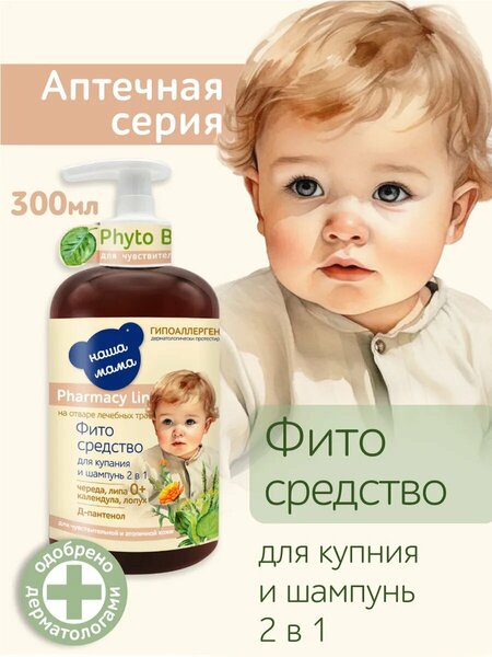 Pharmacy Line/Наша Мама Детское Фито средство для купания и шампунь 2в1, для атопичной кожи, гипоаллергенный, 300мл, 0+