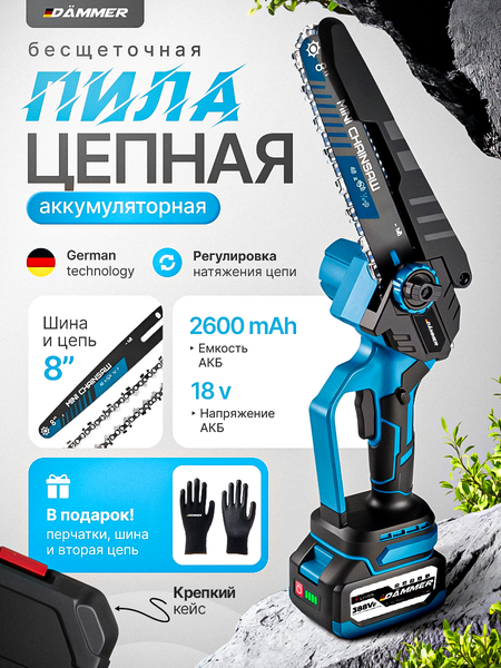 Пила аккумуляторная DAMMER — компактный и мощный инструмент для сада и мелких строительных работ! Эта пила аккумуляторная цепная из линейки DAMMER оснащена бесщеточным двигателем, который обеспечивает высокую производительность, долговечность и минимальный износ. С длиной шины 8" (20 см) и шагом цепи 1/4, мини пила аккумуляторная идеально подходит для обрезки веток, распила дров и ухода за деревьями, работая как сучкорез аккумуляторный цепной. Пила цепная аккумуляторная DAMMER питается от аккумулятора на 2600 мА·ч с напряжением 18 В, совместимого с инструментами Makita, что удобно для владельцев этой марки. Один заряд обеспечивает длительную работу, а полуавтоматическая смазка цепи продлевает срок службы износостойкой цепи. Функция быстрой регулировки цепи без дополнительных инструментов делает обслуживание цепной пилы аккумуляторной простым и удобным, экономя ваше время. Компактная и легкая, мини пила аккумуляторная цепная DAMMER позволяет работать в труднодоступных местах, а эргономичный дизайн снижает усталость рук. В комплекте вы получаете дополнительную шину, цепь и фирменные перчатки для безопасной и комфортной работы. Пила цепная электрическая DAMMER — это мобильность и эффективность для садоводов и мастеров. Аккумуляторная пила сучкорез DAMMER — ваш выбор для точной и легкой обрезки!