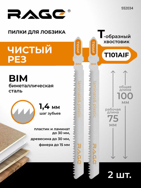 Пилки для лобзика RAGE by VIRA, для твердых сортов древесины, фанеры , ламината, пластика T101AIF,2 шт. Имеют мелкие зубья с шагом 1,4 мм, зубья шлифованные, неразведенные. Рабочая длина пилки – 75 мм. Предназначена для профессиональной работы с древесиной до 20 мм, пластика и ламината любой твердости - до 30 мм, фанеры до 15 мм. Пилка дает чистый рез с аккуратной кромкой. Изготовлены из биметаллической стали BIM. Благодаря глубокому совмещению быстрорежущей HSS и высокоуглеродистой HCS сталей, биметалл имеет повышенную эластичность, износостойкость при сохранении высоких режущих качеств. Этот же материал используют для изготовления полотен для промышленных станковых пил. Пилка имеет T-образный хвостовик, подходящий к большинству современных лобзиков. Рекомендуем пилку для профессиональной работы с отделочными материалами для получения аккуратного реза при большом рабочем ресурсе полотна.