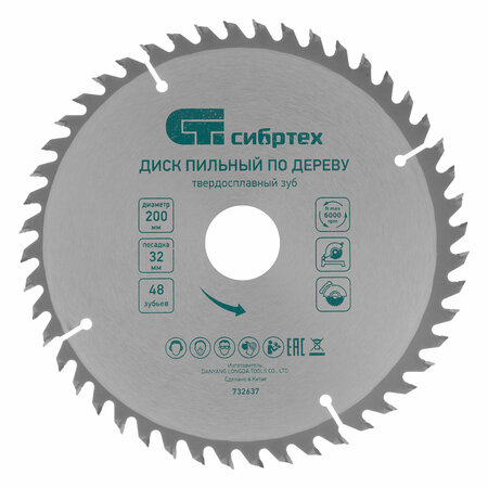 Пильный диск по дереву Сибртех ф200 х 32 мм, 48 зубьев + кольцо 32/30 732637