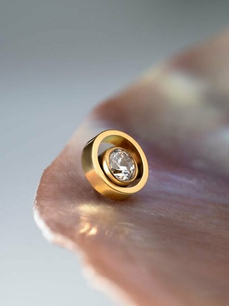 Накрутка для пирсинга украшенная фианитом + ножка из титана марки ASTM F-136. Заводское PVD покрытие золотого цвета, не изнашивается, не стирается. Общий размер накрутки: 3.4 мм. Высота ножки лабрета 6 мм, толщина 1.2 мм (16 G). Лабрет отлично подойдет на прокол конч, хеликс, трагус, мочку и хрящ уха, а так же других видов пирсинга. Титан это идеальный материал для любого свежего прокола, а так же для повседневной носки. Титановые украшения не содержат никель и сводят к минимуму вероятность возникновения аллергических реакций в организме. Титан это самый безопасный материал для пирсинга. -рекомендован для свежих проколов -биосовместимый и гипоаллергенный -не боится влажной среды и не ржавеет. внимание! в комплекте ножка и одна накрутка.
