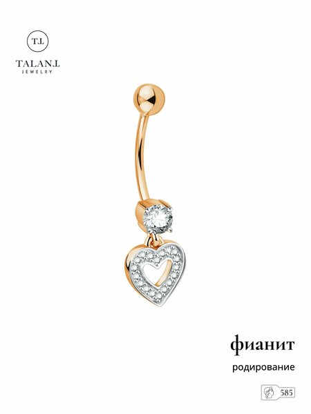 Стильная серьга для пирсинга в пупок в виде сердца из красного золота 585 пробы с фианитами. Вставка: бесцветные фианиты огранки круг 1.0 мм.* 4.0 мм. Украшение в пупок станет стильным и ярким аксессуаром. Родирование защищает от потемнения и увеличивает срок использования. Подлинность подтверждается: пробирным клеймом (пробой), именником производителя, биркой и пломбой завода. Обратите внимание, фактический вес изделия может отличаться от среднего, указанного в характеристиках. О заводе: Санкт-Петербургский Ювелирный Завод TALANT - это крупный производитель по-настоящему качественной ювелирной продукции.
