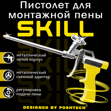 POSHTECH SKILL - Пистолет для монтажной пены из линейки PRO для профессионального использования. Удобный лёгкий монтажный пистолет с возможностью регулировки максимального напора пены. Прочный металлический корпус не подвержен деформации под тяжестью баллона, что позволяет выполнять работу точнее. Облегченная и эргономичная ручка, добавляет удобства при работе без дополнительного утомления. Отличается простотой и надежностью в эксплуатации. Пистолет Skill - выбор настоящих мастеров. · Цельнометаллический корпус, ударостойкий · Хим. Стойкая, пластиковая рукоять - облегченная · Стальной Адаптер - разборный, очень надежное крепление · Стальное Дуло - Двухкамерное с конфузором · Латунное сопло, игольчатый клапан из нержавеющей стали · Стальной Курок · Регулятор напора пены - винтовой, трещеточного типа · Ударостойкий · Пистолет соответствует немецкому стандарту качества Geprufte Sicherheit