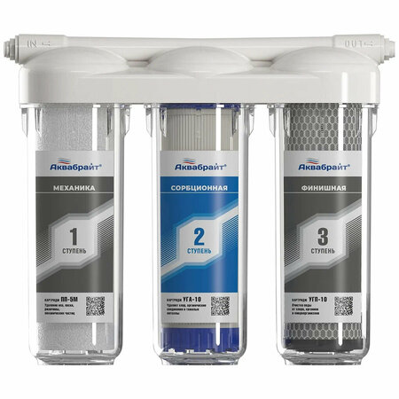 Трёхступенчатые фильтры Аквабрайт абф-триа стандарт предназначены для доочистки питьевой холодной воды центрального водоснабжения после предварительной подготовки от механических примесей, ржавчины, песка, ила, хлорорганических соединений. Фильтр для очистки питьевой воды Аквабрайт абф-триа удобно устанавливается под мойку и укомплектован всем необходимым для самостоятельной установки. Картриджи в комплекте: 1-я ступень ПП-5M механическая очистка 2-я ступень УГА-10 сорбционная очистка 3-я ступень УГП-10 финишная очистка