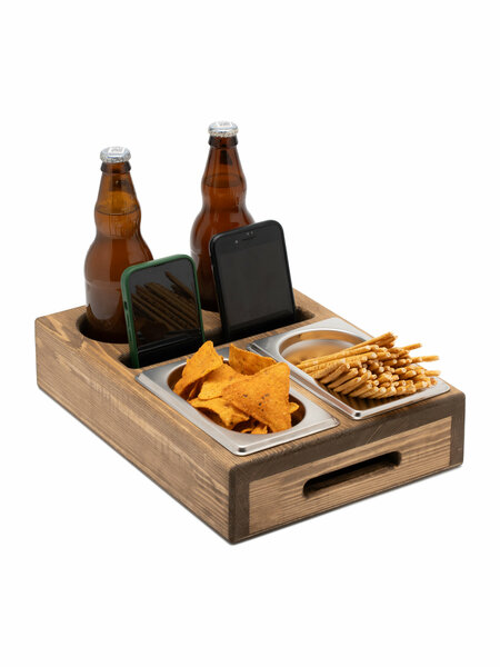 Пивной столик подходит для напитков и закусок для тех, кто любит комфорт или просто дарить подарки. Изготовлен из натурального дерева, что гарантирует его прочность и долговечность. Благодаря этому материалу, столик не только выглядит стильно, но и обеспечивает удобство и комфорт в использовании. Можно использовать как винный столик, столик в кровать, столик-поднос, менажницу. Особенностью пивницы является наличие вырезных ручек, что делает его еще более удобным для использования и переноски. Пивница имеет прямоугольную форму и размеры 35х26х8,5 см. В два гнезда диаметром 83мм помещаются пивные бутылки, банки или бокалы. Глубокие гастроемкости для снеков достаточно вместительны. Они полностью снимаются для удобства поддержания чистоты. Столик устойчив на неровных и мягких поверхностях - мягкий диван, кровать, трава, грунт, песок и даже в машине. Это позволяет наслаждаться вашими любимыми напитками и снеками, не боясь их опрокинуть. Столик пропитан натуральными маслами и воском, что придает ему дополнительную защиту от влаги и увеличивает срок службы. Вес пивницы составляет 1500 грамм, что говорит о его прочности и надежности. Выбирая пивницу, вы получаете не только стильный и функциональный аксессуар для вашего дома, но и надежного помощника, который прослужит вам долгие годы.