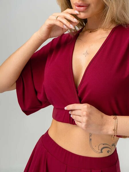 Окунись в нежные объятия! Женская пижама с шортами выполнена из невероятно мягкой вискозы. Легкая ткань, топ c декольте на запах, свободный крой и изящные складки на шортах делают пижаму для женщин не только уютной, но и стильной. Домашний комплект бордового цвета станет любимым атрибутом отдыха девушки. Однотонная ночная пижама вишневого цвета выполнена из мягкой вискозы, которая хорошо пропускает воздух. Благодаря лайкре в составе она идеально садится по фигуре. Красная пижама из трикотажа не боится частых стирок и надолго сохраняет первоначальный внешний вид. Набор двойка из топика и мини шортиков подходит для женщин с любым типом фигуры. Мягкая эластичная резинка нежно прилегает и не сдавливает кожу, а прямой крой дарит уют и свободу движений. Красивый трикотажный комплект с топиком и укороченными шортами идеален для отдыха, сна и поездок. Вискозный костюм для дома можно взять с собой в путешествие, чтобы насладиться комфортом в отпуске. Рост модели 167 см, параметры: объем груди 84, объем талии 58, объем бедер 87. На ней 44 размер.