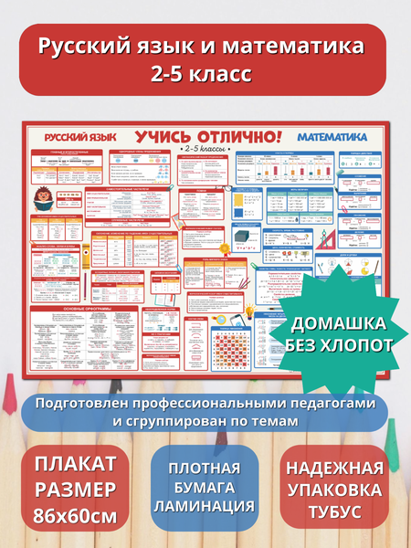 Плакат-шпаргалка "Учись отлично" предназначен для начальной школы и охватывает русский язык и математику для учащихся 2-5 классов. Это незаменимый помощник для родителей и детей, который поможет им быстро и эффективно подготовиться к выполнению домашних заданий и после каникул в 5 классе. Плакат содержит все необходимые правила и формулы по русскому языку и математике, упорядоченные и представленные в удобной форме. Это значительно упрощает процесс обучения и экономит время. Размер плаката составляет 86*60 см, что делает его удобным для использования в классе или дома. Лицевая сторона плаката покрыта ламинацией 40 мкм, что обеспечивает его долговечность и защиту от повреждений. Пособие выполнено на русском языке, что делает его доступным для русскоязычных пользователей. Плакат-шпаргалка "Учись отлично" - это эффективное и удобное решение для тех, кто хочет сделать процесс обучения более простым и приятным. #плакаты для школьников #плакаты для школы #плакаты помощники #шпаргалки для школы