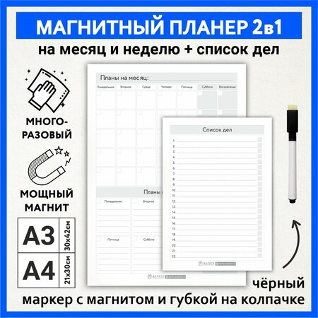 Планер магнитный 2 в 1, А3 - на месяц и неделю с важными заметками, А4 - список дел, маркер с магнитом и стирателем, белый фон, Дарите подарок, planner_background_white_#000_А3, А4_2.12