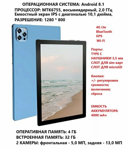 Планшет оснащен 10,1-дюймовым экраном с разрешением Full HD (1280x800) и IPS-матрицей, что обеспечивает четкое и яркое изображение. Частота обновления экрана составляет 60 Гц, что гарантирует плавность и быстродействие при просмотре видео и работе с приложениями. Планшет работает на операционной системе Android 13, что обеспечивает доступ к широкому выбору приложений и игр. 4 ГБ оперативной памяти и 32 ГБ встроенной памяти позволяют хранить большое количество файлов и документов. Планшет оснащен модулем Wi-Fi и Bluetooth для беспроводного подключения к интернету и другим устройствам. Основная камера с разрешением 13 МП и фронтальная камера с разрешением 5 МП обеспечивают качественные снимки и видеозвонки. Планшет имеет слот для карты памяти microSD, что позволяет расширить объем памяти до 1 ТБ. Корпус устройства выполнен из металла, что придает ему прочность и долговечность. Планшет поддерживает работу с 4G LTE, что обеспечивает быстрый и стабильный интернет. Емкость аккумулятора составляет 4000 мАч, что обеспечивает длительное время работы без подзарядки. Планшет оснащен: Порт Type C Слот для micro SD-карты Порт для наушников: 1x 3,5 мм наушники Слот для sim-карт Кнопка регулировки громкости; кнопка включения; кнопка сброса В комплект поставки входят зарядное устройство, USB-кабель, pin-код для сброса, OTG-кабель и инструкция.