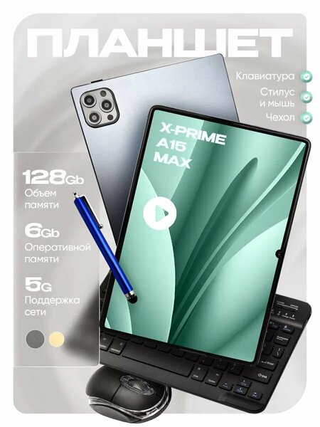 X-Prime A15 MAX - многофункциональный планшет с клавиатурой, ручкой-стилусом и защитным чехлом, который идеально подходит для работы и отдыха в любое время суток. Устройство имеет быстродействующий восьмиядерный процессор и оперативную память в 6 ГБ, что позволяет запускать множество приложений одновременно, а также играть в самые требовательные игры. Внутренняя память в 128 ГБ даёт возможность сохранять множество файлов и документов, он работает на операционной системе Android 13, имеет диагональ экрана 10,1 дюймов и IPS-дисплей, который обеспечивает яркие и сочные цвета, поддерживает 4G LTE и 5G, что позволяет быть всегда на связи с близкими и друзьями, а большая ёмкость аккумулятора — 7000 мАч, обеспечивает работу на протяжении 10 часов. Качественные комплектующие Мощность восьмиядерного процессора и 6 ГБ оперативной памяти обеспечат высокую производительность. Играйте в требовательные игры и запускайте множество приложений одновременно. Внутреняя память Этот планшет имеет внутреннюю память вплоть до 128 ГБ, что позволяет вам сохранять огромное количество файлов, документов и другой важной информации. Благодаря такой ёмкой памяти вы можете хранить все необходимое и иметь доступ к ним в любое время и в любом месте. IPS экран Планшет имеет 10.1-дюймовую диагональ экрана, которая идеально подходит для просмотра различной информации. С разрешением экрана 3000x1440 точек высокой четкости и IPS-дисплеем, он обеспечивает яркие и сочные цвета, создавая удивительно реалистичное визуальное восприятие. 4G LTE / 5G Планшет обеспечивает удобство и связь благодаря поддержке 4G LTE и 5G для быстрой и надежной связи с вашими родными, близкими и друзьями. Этот гаджет обеспечивает гибкость и удобство, чтобы вы могли наслаждаться связью в любое время и в любом месте. 2 SIM Этот планшет предлагает удобство и связь везде, где вы находитесь, благодаря поддержке двух сим-карт. Вы можете оставаться подключенными через Wi-Fi и Bluetooth.
