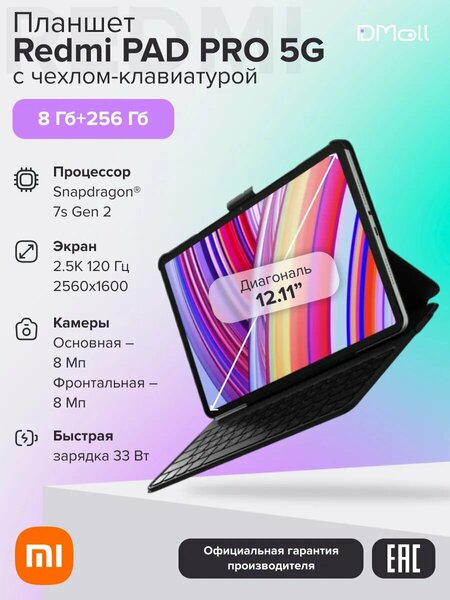 Redmi Pad Pro 5G - это планшет, который переосмысливает мобильные развлечения. Он сочетает в себе мощную производительность, яркий и детализированный дисплей, долговечный аккумулятор и стильный дизайн. Ключевые особенности: Дисплей: 12,11-дюймовый IPS-экран с разрешением 2560 x 1600 пикселей и частотой обновления 120 Гц, обеспечивающий плавное изображение и яркие цвета. Производительность: Чипсет Snapdragon 7s Gen 2 с 4нм техпроцессом гарантирует высокую скорость работы и плавную многозадачность. 8 ядер процессора (4x2.4 ГГц Cortex A78 + 4 x1.95 ГГц Cortex A55) и мощный графический процессор Adreno 710 справятся с любыми задачами. Память: Доступны варианты с 6/8 ГБ оперативной памяти и 128/256 ГБ встроенной памяти. Дополнительно можно расширить память с помощью MicroSD-карты объемом до 1,5 ТБ. Камера: Основная камера 8 Мп с автофокусировкой позволит вам делать качественные снимки и видео. Фронтальная камера с разрешением 8 Мп и широким углом обзора 105 градусов идеально подходит для видеозвонков и онлайн-конференций. Аккумулятор: Батарея емкостью 10000 мАч обеспечит до нескольких часов работы без подзарядки. Поддержка быстрой зарядки 33 Вт (в комплекте адаптер) позволяет быстро восстановить заряд. Дизайн: Стильный металлический корпус с фронтальной панелью из стекла Gorilla Glass 3. Доступен в зеленом, сером и синем цветах. Функциональность: Поддержка 5G сетей, двух SIM-карт (Nano SIM, Dual Standby), Bluetooth 5.2, Wi-Fi 2.4 / 5.0 ГГц (6/6e), USB Type-C (USB OTG), распознавание лица. Redmi Pad Pro 5G - идеальный выбор для работы, развлечений и общения. Он сочетает в себе высокую производительность, элегантный дизайн и доступную цену.