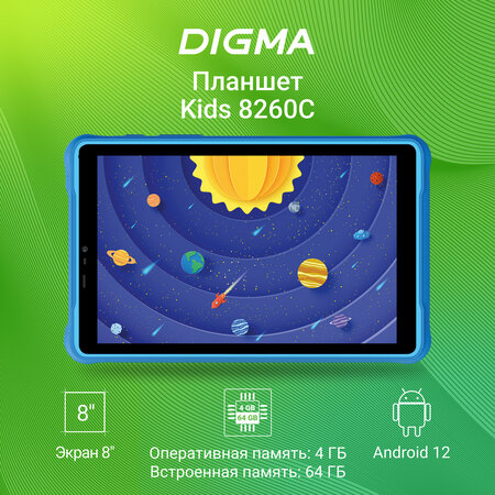 Digma Kids 8260C – детский планшет, который можно использовать для учебы и развлечений. Он оптимизирован для ребенка, но по своим возможностям ничуть не уступает другим подобным мобильным устройствам. Поэтому при необходимости им могут пользоваться и взрослые, если, например, планшет понадобится для работы. Это делает устройство по-настоящему универсальным. Диагональ экрана – 8 дюймов. Такой дисплей достаточно большой, чтобы на нем комфортно было играть, рисовать, смотреть фильмы или читать. В то же время устройство сохраняет компактные размеры. На планшете установлена современная операционная система «Андроид» 12. Она обеспечивает простой доступ ко всем функциям, дает возможность менять настройки и способствует экономии заряда аккумулятора. ОС Android позволяет скачивать платные и бесплатные приложения. Высокую производительность обеспечивает процессор Unisoc T310 с тактовой частотой 2 ГГц. Благодаря ему устройство уверенно справляется со сложными задачами.Встроенная память объёмом 64 ГБ позволяет установить все необходимые приложения и сохранить большое количество файлов всех типов. Хватит места для фотографий и музыки, видеороликов, эпизодов сериалов и полноразмерных фильмов. Планшет «Дигма Кидз 8260С» предлагает альтернативный способ доступа в интернет – с помощью Wi-Fi 5. Доступны диапазоны 2,4 ГГц и 5 ГГц. Можно экономить мобильный трафик дома и в других местах, где есть точка доступа Wi-Fi. Поддержка Bluetooth 5.0 позволяет транслировать данные на совместимые устройства без проводного соединения. Эта функция пригодится для обмена данными с другими устройствами или подключения наушников либо портативной колонки. Сим-карта распространенного формата microSIM открывает доступ в интернет. Можно подключаться к сетям 4G в любой точке в пределах зоны покрытия оператора мобильной связи. Легкий компактный девайс можно брать в поездки, в гости, на дачу и не волноваться за его сохранность при транспортировке.