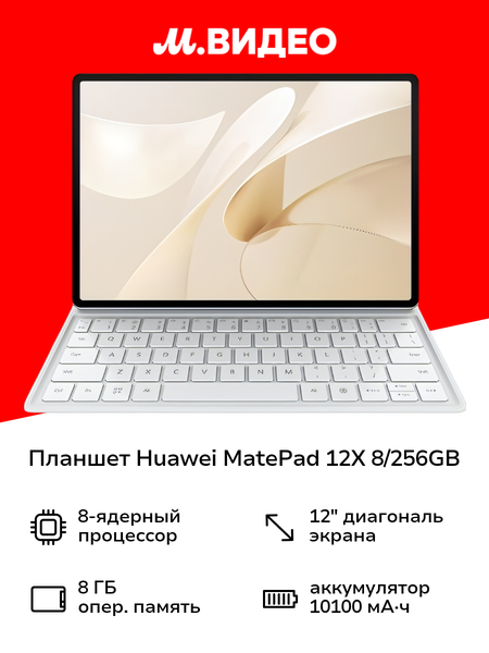 Планшет Huawei MatePad 12X Wi-Fi inbox +kb White 53014CV удобен и для развлечений, и для работы, в том числе с графическими программами. Поставляется с клавиатурой, что позволяет использовать его как обычный ноутбук. • 12-дюймовый экран Обладает разрешением 2800x1840 пикселей. Предустановлено приложение GoPaint, с которым можно начать рисовать. • Стилус M-Pencil Поддерживается работа со стилусом - работать с планшетом можно привычным образом, словно вы рисуете и пишите в обычном скетчбуке и блокноте. Технология NearLink обеспечивает высокую скорость передачи данных. • Частота обновления 144 Гц Отвечает за плавность отображения любого динамичного контента. • 256 Гб встроенной памяти Можно сохранить значительное количество рисунков, разнообразных документов, видео, музыки и прочего. • Длительная автономность Достигает 13 часов и обеспечивается литий-полимерным аккумулятором емкостью 10100 мА*ч. Планшет поддерживает быструю зарядку 11В/6А. В основе системы - восьмиядерный процессор HiSilicon частотой 8 x 2,0 ГГц и 8 Гб оперативной памяти. Планшет снабжен модулем Wi-Fi для выхода в Сеть и сам может выступать точкой доступа в интернет. Bluetooth 5.2 позволяет обмениваться данными с другими устройствами. Модель работает на ОС HarmonyOS 4.2. Основная камера двойная: 13/8 Мп. В условиях недостаточного освещения выручит вспышка. Для общения по видеосвязи предусмотрена фронтальная камера на 13 Мп. Объемный звук обеспечивают шесть встроенных динамиков, передачу речи - два микрофона. Корпус выполнен из металла, что повышает его устойчивость к механическим воздействиям.