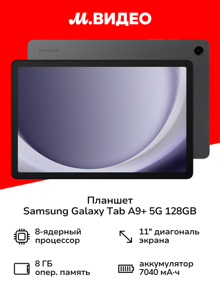 Планшет Samsung Galaxy Tab A9+ 5G Graphite (SM-X216B) обладает экраном диагональю 11 дюймов разрешением 1200x1920 пикселей. Отображается 16 млн цветов. Частота обновления составляет 90 Гц, что обеспечивает плавность прокрутки страниц. В основе модели лежит восьмиядерный процессор Qualcomm Snapdragon 695 5G, частота которого достигает 2,2 ГГц. В сочетании с 8 Гб оперативной памяти он гарантирует стабильную работу. Объем хранилища данных - 128 Гб, при необходимости его можно увеличить за счет карты microSD (до 1024 Гб). Встроены модули Wi-Fi и Bluetooth для выхода в интернет и обмена файлами с совместимыми устройствами. Поддерживается технология Wi-Fi Direct. Четыре динамика воспроизводят громкий звук, микрофоны отвечают за точную передачу речи при общении, в том числе по видеосвязи - для этого предусмотрена фронтальная камера разрешением 5 Мп. Можно подключить проводные наушники через 3,5-миллиметровый разъем. Тыловая камера на 8 Мп способна снимать качественные фотографии и видеоролики. Автономность обеспечивает аккумулятор емкостью 7040 мА*ч. Зарядка производится через порт USB-Type C. Корпус планшета выполнен из пластика.