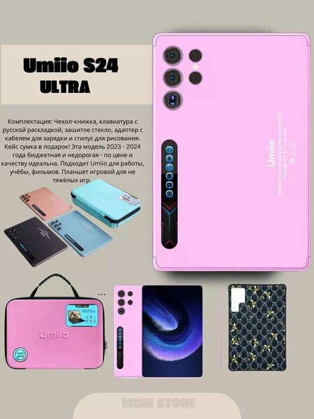 Планшет Umiio S24 ultra - андроид с клавиатурой стилусом и чехлом. Комплектация: Чехол-книжка, клавиатура с русской раскладкой, зашитое стекло, адаптер с кабелем для зарядки и стилус для рисования. Кейс сумка в подарок! Эта модель 2023 - 2024 года бюджетная и недорогая - по цене и качеству идеальна. Подходит Umiio для работы, учёбы, фильмов. Планшет игровой для не тяжёлых игр. Клавиатура с русской и английской раскладкой подключается через Bluetooth и обеспечит удобство ввода текста. Так же по блютузу или через переходник TYPE-C можете подключить мышку. Наушники и колонки так же можно подключить беспроводные и проводные AUX. Планшет детский Android имеет быстрый доступ к интернету используя Wi-Fi или мобильный интернет при подключении сим-карты для звонков. Можно использовать как телефон смартфон и оставаться на связи в любое время. Если вам не хватит памяти, можете добавить дополнительную карту памяти 32 гб, 64 гб или 128 гб. Поддерживает LTE обеспечит быстрый и стабильный интернет.