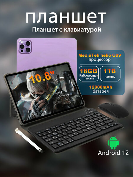Планшетный ПК оснащен процессором Mediatek G99 и 16 ГБ оперативной памяти, что обеспечивает высокую производительность и быстродействие. 1 ТБ встроенной памяти позволяет хранить большое количество данных, а поддержка 2 SIM-карт предоставляет возможность выбора оптимального оператора связи. Планшет оснащен 10,8-дюймовым IPS HD экраном 16:9 с разрешением 3840x2160 и фронтальной камерой 32 Мп. Задняя камера 64 Мп позволяет делать качественные снимки и записывать видео. Аккумулятор емкостью 12000 мАч обеспечивает длительное время работы без подзарядки, а версия Android 12 предоставляет доступ к широкому спектру приложений и игр. Планшетный ПК поддерживает беспроводную связь через Bluetooth, Wi-Fi и GPS, а также сотовую связь 3G, 4G LTE и 5G. В комплект поставки входит клавиатура и стилус, что делает использование планшета еще более удобным и функциональным. Планшет выполнен в стильном фиолетовом цвете и имеет глобальную версию, что гарантирует его совместимость с большинством мировых стандартов и доступность обновлений операционной системы.
