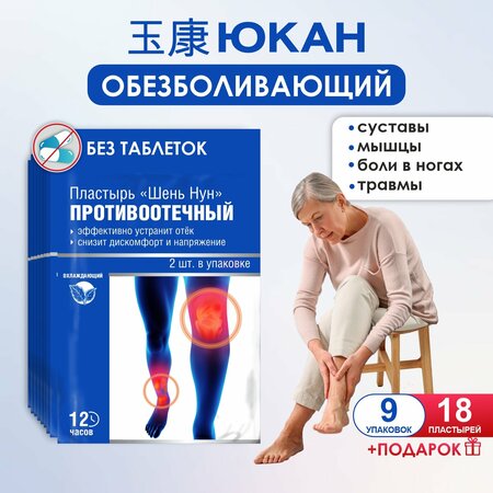 Охлаждающий китайский пластырь от отеков юкан Шень Нун быстро снимает отечность, устраняет тяжесть и боль в ногах. Благотворно влияет как на мышцы, так и на суставы: эффективно устраняет дискомфорт при ушибах, травмах, растяжениях. Размер лейкопластыря 11*7 см. В упаковке 2 шт. Производится на крупном фармацевтическом заводе в Китае, который работает с 1997 года и имеет все необходимые сертификаты ISO9001: 2008, CE, MSDS, FDA. В состав входит биокомплекс концентрированных экстрактов трав, корней, семян и эфирных масел. Комплекс растительных компонентов оказывает местный раздражающий эффект, влияет на расширение сосудов и улучшение локального кровообращения, что способствует противоотечному и обезболивающему эффекту, питанию тканей и ускорению восстановительных процессов. Тканевые пластыри юкан можно разрезать на части в зависимости от зоны применения, одного может хватить на несколько применений. Применение: наклеить на проблемное место, предварительно обезжирив кожу теплой водой или спиртосодержащим раствором. Время применения: 1-12 часов в зависимости от симптомов. Длительность применения: до 7 дней. Можно использовать целиком или разрезать на части нужного размера. Противопоказания: индивидуальная непереносимость компонентов, беременность, кормление грудью. Не наносить на поврежденные участки кожи. Только для наружного применения. При ощущении сильного жжения или раздражения прекратить использование. В наборе представлено 9 упаковок по 2 штуки размером 11х7 см в каждой. Вы можете приобрести набор с различным количеством упаковок в зависимости от ваших потребностей.