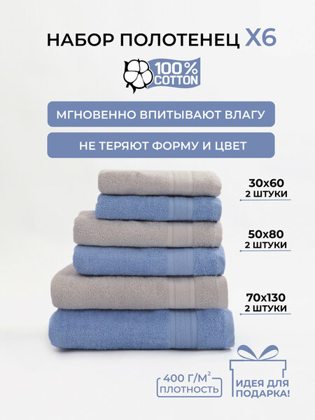 Большой набор махровых полотенец 6 шт - 30х60 2 шт, 50х80 2 шт, 70х130 2 шт. Махровые полотенца Comfort Life созданы из 100% натурального хлопка высокого качества. Мягкие и пушистые банные полотенца идеально подходят для повседневного использования, хорошо впитывают влагу и быстро сохнут. Изделия отличаются высокой плотностью 400 г/м2, что улучшает их впитываемость в несколько раз, а также делает прочными и долговечными. Использование современной технологии air dry делает махровые полотенца невероятно мягкими И пушистыми. Продукт не содержит микрофибры и подходит для чувствительной кожи. Махровое полотно не линяет и сохраняет яркость цвета даже после многочисленных стирок. Не требует специального ухода. Махровые полотенца без петельки и рисунка, выполнены в классическом однотонном дизайне, что делает их универсальными и подходящими для любого интерьера ванной комнаты. Произведено в Узбекистане, это качественное полотенце является отличной альтернативой турецким и туркменским изделиям. В нашем ассортименте вы найдете большие и маленькие изделия: 70х130 и 100х150 см можно использовать для ванны, сауны, бани, а также для пляжа и спортивных тренировок; 50х80 и 30х60 см подходит для лица, для рук, для волос. Отличный подарок для любого случая, в том числе на свадьбу, новоселье и Новый год. Обычно дарят женщине на 8 марта, день рождения, свадьбу или юбилей. Мама, бабушка, любимая жена, девушка, сестра, подруга или коллега, учитель или воспитатель по достоинству оценят такой нужный и полезный подарочный набор. Большой выбор расцветок, позволяет собрать как женский, так и мужской набор, который придется по душе мужчинам и станет удачным подарком папе, дедушке, любимому мужу или другу на 23 февраля. Полотенца банные подходят как для взрослых, так и для детей – нравятся мальчикам и девочкам. Активно используются в гостиницах, парикмахерских и спа-салонах. Махровые изделия рекомендуется стирать перед первым применением. Во время стирки удалятся излишние ворсинки, которые прилипли в процессе производства, а сами полотенца станут более мягкими и пушистыми. Вы можете купить комплект одинаковых полотенец или подобрать подходящие вам сочетания и по цветам, и по декоративным элементам. Выбирайте полотенце махровое для создания атмосферы комфорта и уюта в вашей ванной комнате. Берегите свою кожу и окружающую среду, используя натуральные и экологически чистые материалы!