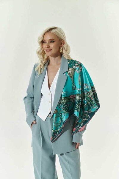 Удивительная нежность, изящество и чистота — это первые ассоциации, рождающиеся в голове при знакомстве с платком «Яйцо Фаберже Ландыши». На создание столь привлекательного дизайна художников вдохновил один из роскошных шедевров ювелирной коллекции Карла Фаберже. Это драгоценное яйцо 1898 года, подаренное Николаем II своей супруге императрице Александре Федоровне. Сувенир на тонких ножках-кабриолетах покрыт гильошировкой, эмалью, золотом, бриллиантовыми каплями росы розовой огранки. Само яйцо обрамляют головки миниатюрных ландышей — любимых цветов жены императора. Пасхальный подарок, красующийся в центре принта платка, был изготовлен в стиле ар-нуво с характерной для него “натуральной” составляющей. Шелковый платок женский на голову и шею — это стильный и многофункциональный аксессуар, который станет незаменимым элементом вашего гардероба. Изготовленный из шелка, он обеспечивает комфорт и приятные тактильные ощущения при ношении. Этот платок не только красиво смотрится, но и прекрасно выполняет свои практические функции, защищая от ветра и солнечных лучей. Платок женский на голову идеально подходит для создания различных образов. Вы можете носить его как косынку, завязывая на голове, или же использовать в качестве стильного акцента на шее. Женский шейный платок станет оригинальным дополнением к вашему наряду, позволяя выразить индивидуальность и подчеркнуть женственность. А благодаря своим универсальным размерам и легкой текстуре, данный аксессуар легко комбинируется с любой одеждой!