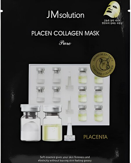 JMsolution Рlacen collagen mask pure премиальная плацентарная тканевая маска с коллагеном глубоко питает кожу активными компонентами, оказывает мощный антивозрастной эффект, восполняет недостатки влаги. Маска оказывает интенсивное омолаживающее действие, замедляет процессы старения и способствует разглаживанию морщин. *Главный компонент-плацентарный протеин-биологический комплекс, обладающий мощным лифтинг эффектом, улучшает тургор (плотность) кожи, является строительным материалом для клеток кожи, плацента хорошо действует на жирную кожу, уменьшает поры, помогает справиться с угревой сыпью. *Плацентарная тканевая маска с коллагеном JM Soluthion Placen Collagen Mask Pure глубоко питает кожу активными компонентами, оказывает мощный антивозрастной эффект, восполняет недостаток влаги. Маска оказывает интенсивное омолаживающее действие, замедляет процессы старения и способствует разглаживанию морщин. Главные особенности тканевой маски: глубоко питает кожу и интенсивно увлажняет; стимулирует выработку собственного коллагена и эластина; запускает процессы регенерации и стимулирует клеточное обновление; повышает иммунитет кожи; борется со всеми признаками возрастных изменений; разглаживает рельеф кожи, выравнивает тон; наполняет сиянием. Активные ингредиенты Главный действующий компонент маски — плацентарный протеин — биологический комплекс, соединяющий в себе аминокислоты, белковые факторы роста, витамины, макро и микроэлементы, которые обладают лифтинг-эффектом, дают коже питание и увлажнение, улучшают тургор кожи, и являются строительным материалом для клетки, плацента хорошо действует на жирную кожу, уменьшает поры, помогает справляться с угревой сыпью. Комплекс пептидов (Tripeptide-1, Copper Tripeptide-1, Palmitoyl Pentapeptide-4, Palmitoyl Tripeptide-1, Acetyl Tetrapeptide-5, Acetyl Tetrapeptide-2, Hexapeptide-9, Hexapeptide-11, Palmitoyl Tripeptide-5, Acetyl Hexapeptide-8, Palmitoyl Tetrapeptide- 7) — увеличивает упругость и эластичность кожи, ускоряет процессы выработки организмом собственных волокон коллагена и эластина. Уменьшает глубину морщин и препятствует обвисанию кожи. Укрепляет защитный барьер кожного покрова. Коллаген улучшает общее состояние кожи: разглаживает и выравнивает ее, делает упругой и эластичной, убирает мелкие морщинки и освежает. Обладает ранозаживляющим и успокаивающим действием, удерживает влагу в глубоких слоях кожи. Гиалуроновая кислота — отвечает за глубокое увлажнение кожи и поддержание на оптимальном уровне естественного ph-баланса кожи. Гиалуроновая кислота образует на коже неосязаемый защитный слой, который препятствует испарению влаги и дарит комфортное ощущение свежести и увлажненности на лице. Трегалоза — полисахарид, который оказывает мощное увлажняющее действие, замедляет процессы старения и обладает антиоксидантной активностью. Аллантоин смягчает, интенсивно увлажняет кожу, способствует сужению пор и нормализации выработки кожного сала, обладает противовоспалительными свойствами, успокаивает раздраженную кожу. Подходит для зрелой кожи.