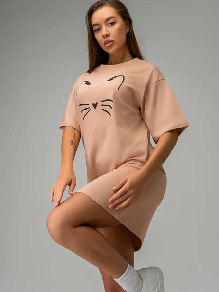 Повседневное женское платье-футболка оверсайз выполнено из натурального 100% хлопка. Домашнее платье не стесняет движений. Благодаря удобному А-силуэту и широкому размерному ряду платье для дома отлично смотрится на девушках с любым типом фигуры. Удлиненная футболка украшена милым принтом лапки, котик, надписи. Тунику с короткими рукавами можно носить как домашнее платье или использовать как ночную сорочку. Трикотажная туника на каждый день просто создана для комфорта! Мягкая, приятная на ощупь ткань не вытягивается, пропускает воздух, сохраняет цвет даже после многочисленных стирок.