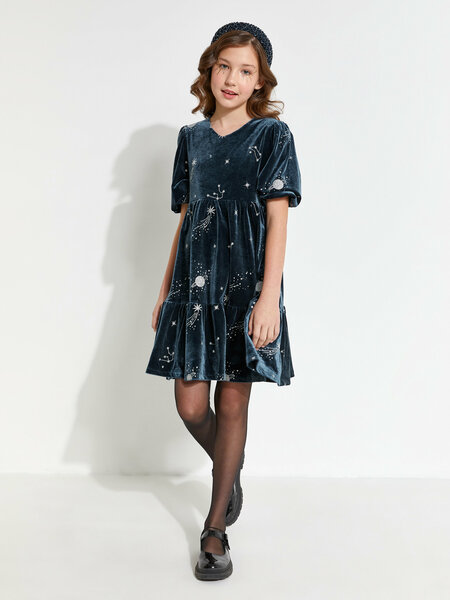 Праздничное платье для девочки выполнено из принтованной бархатной ткани на хлопковой подкладке. Мерцающие серебристые планеты и созвездия контрастно выделяются на тёмно-синем фоне. Модель свободного силуэта, длиной до колена, отрезная по линии талии. Рукав-фонарик на мягкой резинке. Застежка на спинке - разрез с петлей и пуговицей.