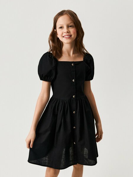 Детское повседневное черное платье для девочки изготовлено из качественной хлопковой ткани, обеспечивающей комфортное ношение в течение всего дня. Модель приталенного силуэта, отрезная по линии талии, со сборкой у шва. Спереди расположена застежка на контрастные пуговицы и петли, облегчающая одевание. Пышные рукава-фонарики с эластичной резинкой сверху и снизу придает модели воздушности и придает маленькой моднице облик настоящей принцессы. Вырез-каре придает образу дополнительный стильный акцент. Удобная длина до колена делает модель подходящей для разных случаев. 20210200753
