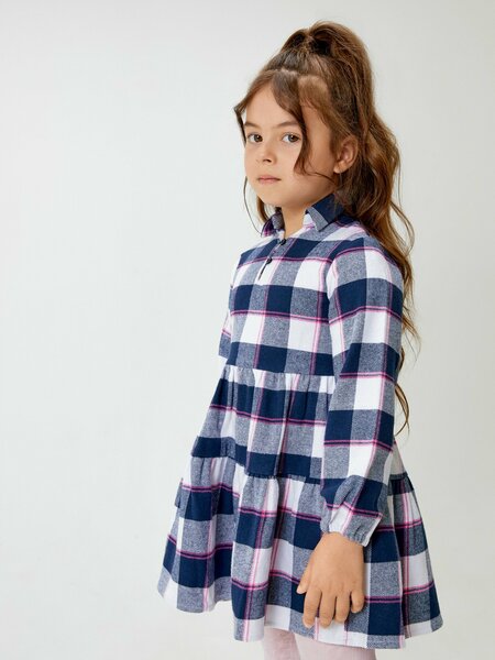Платье для девочки выполнено из дышащей хлопковой ткани. Модель свободного силуэта, длиной до колена, воротник рубашечный. Перед с застежкой-каплей на петли и пуговицы. Рукав длинный, без манжет, низ рукава присобран на резинке. Комбинируйте платье со светлыми колготками и туфлями "Мэри Джейн" или сапожками для создания модного образа. Рост модели на фото: 110