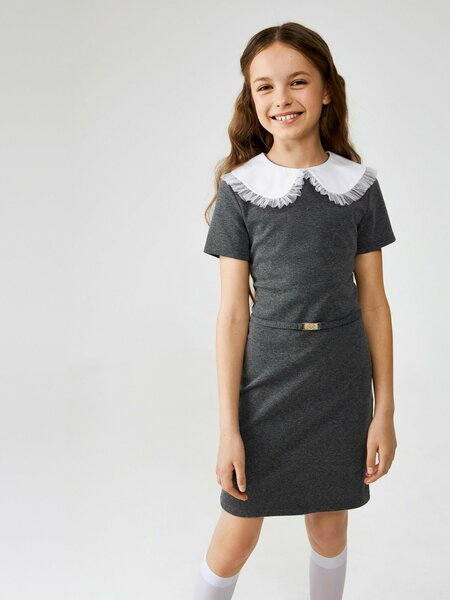 Школьное платье с воротничком для девочки изготовлено из плотного трикотажа. Стильная и строгая модель длиной до колена комфортна в ношении на протяжении всего дня. Платье прилегающего силуэта обеспечивает классическую посадку по фигуре, а короткие рукава делают модель подходящей для тёплых дней. Акцентный несъёмный плосколежащий воротник с оторочкой по краю придаёт изделию изысканной торжественности. Ещё одна интересная делать - это имитация пояса с золотистой пряжкой, расположенная спереди: она подчеркнет линию талии и уравновесит силуэт. Талиевые вытачки на спинке обеспечат комфортное прилегание к телу. Модель представлена в трёх базовых цветах: чёрном, сером и тёмно-синем, благодаря чему можно с легкостью подобрать подходящий вариант для школьной формы и строгого дресс-кода. Стилизуйте с гольфами и туфлями на плоской подошве для создания уточненного делового аутфита. Размер на модели: 140