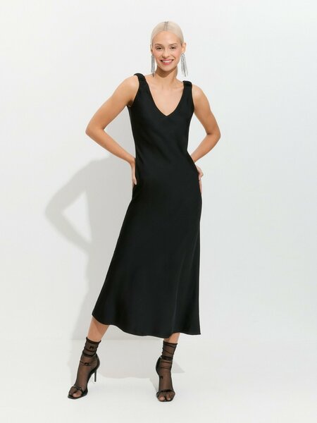 Женское вечернее платье миди с декольте приталенного силуэта изготовлено из полиэстера. Модель прилегает к телу, создавая комфортную посадку по фигуре и подчеркивая её красивые линии. Праздничное черное платье длиной ниже колена удобно в ношении и подходит для мероприятий разного формата. Стильный V-образный вырез спереди и на спинке открывает ключицы и зону декольте, создавая чёткий акцент. Женское платье без рукавов открывает руки, позволяя дополнить образ перчатками и привнести в него уточненной грации. В лямках вставлена эластичная лента, благодаря которой ткань ложится, образуя акцентные сборки. Базовый черный цвет делает модель универсальной частью гардероба. Дополните платье акцентными сверкающими серьгами (10206220363), чтобы быстро создать волнующий вечерний образ для новогодней вечеринки, корпоратива, дня рождения или любого другого торжества.