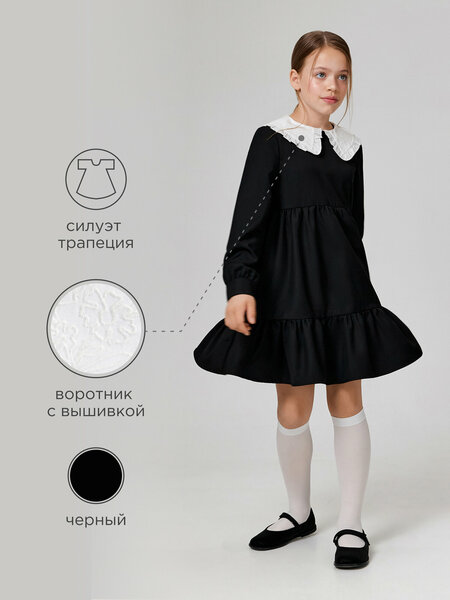 Черное платье для девочки — это ещё одна стильная модель из школьной коллекции. Стильная модель трапециевидного силуэта, длиной до колена комфортна в ношении, так как позволяет большую свободу движений, а также подходит для строгого учебного дресс-кода. Платье с белым воротником выполнено из плотной смесовой ткани, которая не просвечивает и отлично сохраняет форму. Платье с длинными рукавами, которые заканчиваются манжетами на пуговицах-бусинах. На спинке расположен разрез и застежка пуговицу и петлю, благодаря которой одевание становится быстрым и легким. Главное украшение модели — белый воротник с утонченной вышивкой и изящной рюшью по краю. Ярусная юбка платья со сборками у швов спадает мягкими складками. Дополните платье удобными туфельками, чтобы завершить образ для учёбы или торжественных мероприятий. 20240200139