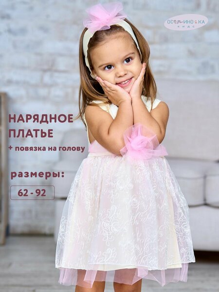 У маленькой принцессы должно быть много платьев! Но где же найти изящное и удобное, и чтобы дочке понравилось? Обратите внимание на легкое платье - сарафан молочного цвета. Сверху кружевная ткань с вышитыми цветами. Второй слой сеточка нежно - розового оттенка - юбка, как мягкое облачко. Снизу приятный материал тонкий поплин, чтобы ножки Вашей красавицы всегда окутывала нежность. Легко застегивается на спинке кнопками комфортно. Украшено большим бантиком в виде малинового цветка. Тщательно продуманные детали и швы не раздражают кожу грудничка. Готовый набор на Праздничный наряд в подарок, в сад, на фотосессию, туника хлопковая, яркая, с принтом, с рисунком, пышная пачка на праздник из фатина. Костюм нарядный отличный вариант на сюрприз детям, подойдет на 1 годик, на день рождения ребенку 2 года. Идеально для садика, свободное летнее платье на утренник для похода в гости или на событие с коротким рукавом модная одежда для девочек и малышек пасха бальное. Комплект из платья и повязки.
