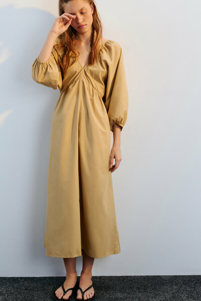 - Длинное женское платье-сарафан миди приталенного кроя из легкой и приятной к телу ткани с добавлением хлопка и гладкой текстильной фактурой - Глубокий V-образный вырез на груди, открытая спинка с длинными завязками. Укороченные суперширокие рукава-фонарики с присборенными манжетами на резинке. Свободная широкая юбка А-силуэта с завышенной линией талии и резинкой на поясе - Однотонное песочно-бежевое платье на лето. Стильное, легкое и очень удобное летнее платье кроя широкая трапеция с рукавами-фонариками и открытой спиной для повседневных и вечерних аутфитов. Платье создаст образы, которые не стесняют свободу твоих движений и дарят комфорт на весь день. Сочетай его с любой удобной обувью и аксессуарами и создавай привлекательные и расслабленные луки на каждый день или в долгожданный отпуск на море - Размер на модели: S