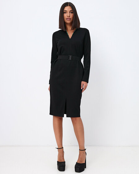 Трикотажное платье, прямого силуэта, футляр. Воротник стойка. V-образный фигурный вырез. Внутри выреза, красивая отделка из шелковой, контрастной ткани бежевого цвета, с черным принтом леопард. Длина по спинке 102 см. середина колена. Платье миди. Спереди и по спинке центральный шов. Внизу по переду разрез. Спереди косые нагрудные вытачки. Рукав длинный. Без карманов. Пояс выполнен из красивой качественной резинки. Пряжка итальянская, матовая. Размер в размер. Трикотаж плотный, пластичный. Качество плетения, джерси. Маломнущийся. Не вытягивается, не просвечивает. Цвет синий, темный. Катышек не образует. В составе бамбук, придает мягкость ткани и бархатистость на ощупь. Вискоза дает комфорт и позволяет коже дышать. Осенью и зимой теплое. Трикотаж производства Турция. Сезон: осеннее зимнее весеннее. Платье офисное деловое, строгое. Красивая отделка внутри выреза, придает платью праздничность, нарядность. Позволяя его носить на торжества, как вечернее. Если носить без ремня, то оно выглядит в стиле оверсайз или бохо и подойдет для больших размеров и беременным женщинам.
